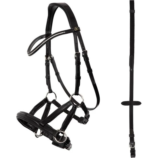Das weich unterlegten Leder beim Nasenriemen und beim Genickstück sorgt für eine sanftere Wirkung auf der Nase und auf den Ohren. Beim Anziehen der Zügel, kommt es vor allen zum Druck auf der Nase und möglicherweise ein bisschen bei den Ohren. Der Trensenzaum ist leicht zu verstellen dank der glänzenden Schnallen.
