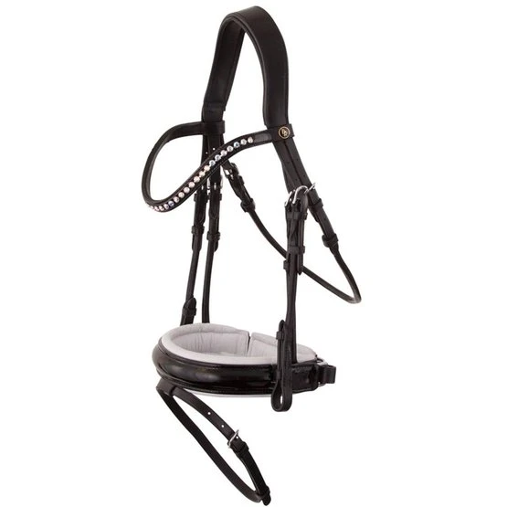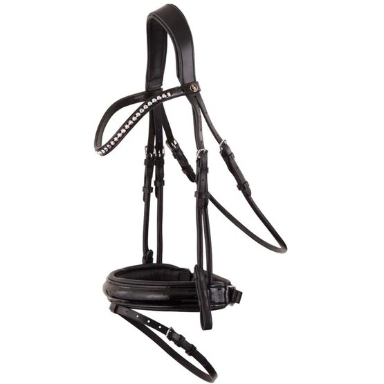 Symmetrische Trense mit einem anatomisch geformten Genickstück, weich unterlegt. Das geschwungene Stirnband aus Lackleder wurde mit SWAROVSKI ELEMENTS besetzt und ist weich unterlegt. Das extra breite (circa 4.5 cm), Schwedisch kombinierte Reithalfter aus Lackleder ist rundgenäht, weich unterlegt und hat ein breites Kinnpolster. Die Trense hat eine V-förmige Schlaufe für den Sperriemen und Zaumhaken. Der Nasenriemen, Kehlriemen und die Backenstücke sind rundgenäht. Die Trense hat silberfarbene runde Schnallen. Lieferung ohne Zügel.