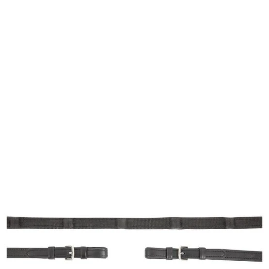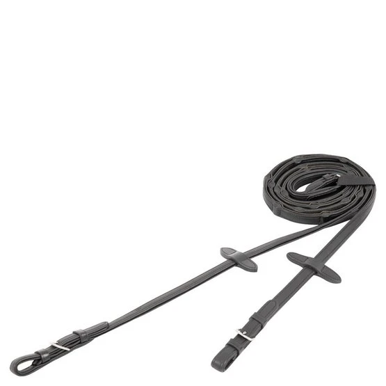 Dieser Lederzügel besitzt Beschläge aus Chrom und neun bedeckte Martingalschieber. Der Zügel ist einseitig mit rutschfestem Material bedeckt. Spezielles Detail: die Martingalschieber sind mit dem Leder umhüllt. Breite: 16 mm.