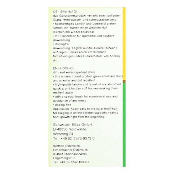 | Schmutz-und wasserabweisender Glanz. Das Ganzjahresprodukt verleiht einen brillanten Glanz, wirkt wasser- und schmutzabweisend. Hochwertiges Lanolin und Lorbeeröl ziehen schnell ein, härten einen weichen Huf, machen ihn wieder belastbar. Mit Pinseldose für sparsame und saubere Anwendung. Dopingfrei