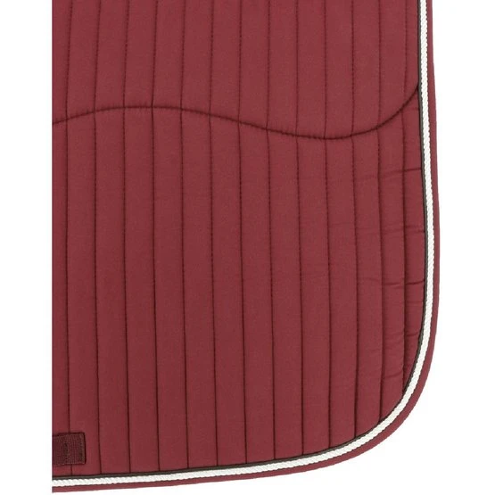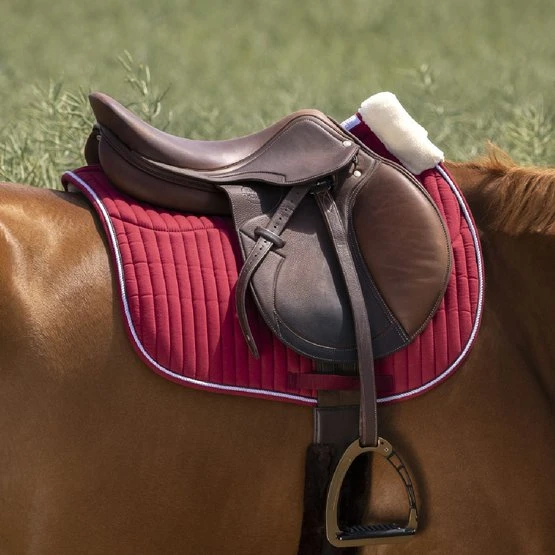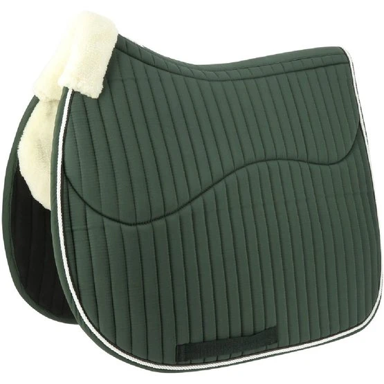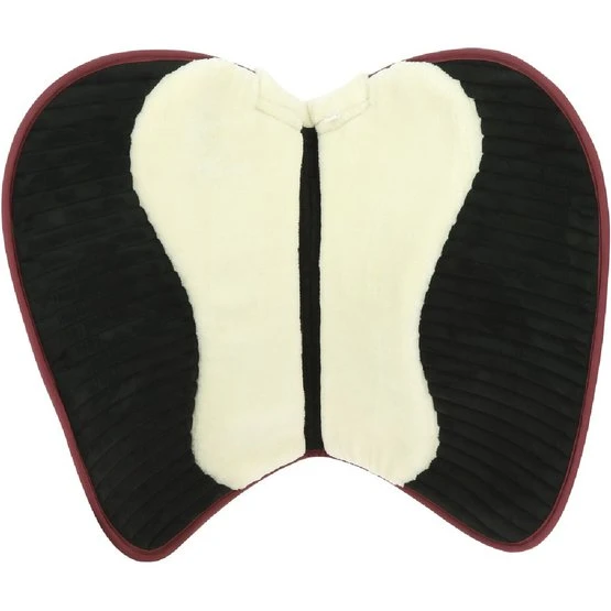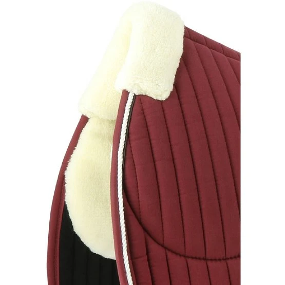 Polyestersattelunterlage mit 300 g / m² Polyfüllung und 10 mm Schaumfüllung. Umfangschlaufen. Synthetisches Schaffellfutter oben drauf. Dekoriert mit einer dünnen weißen Schnur und braunem Rand.