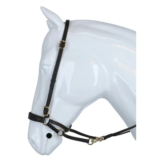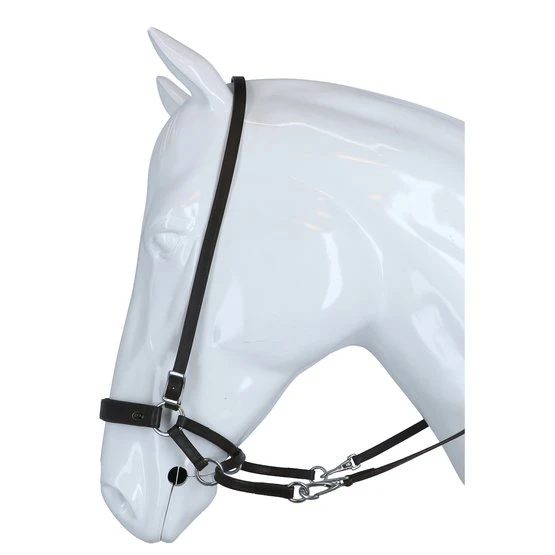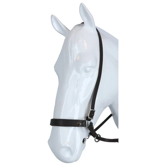 FRA Gebissloses System 4: Gebisslose Zaumzeuge sind nicht neu! Jahrhundertelang galt ein gebissloses Zaumzeug als selbstverständlich, bevor man überhaupt daran dachte, dem Pferd etwas ins Maul zu legen, legte man einfach etwas darum. Damals reichte ein Seil als Halfter und so entstand das erste gebisslose Zaumzeug. In Kombination mit Stützgewicht, Bein- und Tasthilfe hält die Reiterhand über die Zügel den Kontakt nicht mit dem Maul, sondern mit dem Kopf des Pferdes. Funktionsprinzip: Druck auf Nase und Wangen, Kinn gekreuzte Zügel. Konstruktion: Bei diesem System endet der Nasenriemen beidseitig mit einem Ring, an dem die Backenstücke und die beiden Kinnriemen im Schritt befestigt werden. Diese Riemen finden ihre Querführung durch einen Ring am Ende eines kurzen Lederstücks, das wiederum an den Ringen des Nasenriemens befestigt ist. Das Ergebnis ist, dass das kreuzweise Ganze etwas tiefer hängt als bei gekreuzten Zaumzeug (siehe System 5). Die Zügel werden an den Enden der Schrittgurte befestigt. Darüber hinaus ist dieses Zaumzeug einfach in der Ausführung aufgrund des Fehlens eines Stirnbandes, eines Kehlriemens und der Beule und Schnalle, die wir normalerweise an einem Nasenriemen finden. Auf der linken Seite befindet sich eine Schnallenverbindung in der Backe, sie ist die einzige Schnalle die benötigt wird um die Trense auf Maß zu bringen. Einmal angepasst, schieben Sie das Zaumzeug dieses Systems einfach auf den Pferdekopf und müssen danach nichts mehr befestigen. Für die FRA®-Baumwoll-Trensen aus der System 4-Serie gilt im Wesentlichen das oben Gesagte, natürlich gibt es bei dieser Trensenlinie keine Schnallenverbindungen oder sonstige lederbezogene Beschreibungen. Position: Wie bei den meisten gebisslosen Trensen erfordert auch das System 4 Trensen, dass das Nasenband auf dem harten Teil der Nase liegt, ungefähr dort, wo das Nasenbein beginnt. Die spezielle Konstruktion dieser Trensen sorgt für einen guten und festen Sitz am Pferdekopf, ohne dass etwas befestigt werden muss. Wirkung: Die Kinn-Kreuzriemen sorgen dafür, dass das Pferd beim Nachfragen nach links oder rechts Druck auf Nase und Wange auf der anderen Seite bekommt und dann der Reiterhand folgt: dreht sich durch Druck. Gleichzeitiges Anhalten an beiden Zügeln schließt das Nasenband und bietet Möglichkeiten zum Anhalten oder Tempowechsel. Die oben erwähnte Frage nach dem linken, rechten oder beiden Zügel hat aufgrund der indirekten Zügel immer eine gewisse Dosierung, die den Grad der diskriminierenden Wirkung bestimmt. Als Ergebnis wird eine gewünschte Änderung des Diskriminierungsgrades immer einen glatten Effekt haben. Natürlich werden Zügelhilfen mit anderen Stützhilfen unterstützt. Der Verbindungsriemen, der die Zügelführung mit dem Nasenriemen und dem Backenstück verbindet, sorgt für eine tiefe Position und freien Durchgang der gekreuzten Kinnschrittriemen, was die Auslösung stark verbessert. Besondere Aufmerksamkeit muss bei dieser Art von Zaumzeug immer der Pflege der gekreuzten Kinnriemen geschenkt werden, die richtige Pflege gibt dem Leder die Flexibilität, die richtige Freigabe in den Ringen dauerhaft zu erfahren. Das Zaumzeug eignet sich nicht zum Longieren mit dem Einzellonge und daher nicht zum Longieren von Pessoa. Zum Longieren auf den Doppelleinen nehmen Sie die Zügel ab und verwenden Sie die gelösten Ringe, um die langen Leinen zu befestigen. Eignung: Das Zaumzeug wird in Kombination mit leichtem Zügelkontakt verwendet und ist sehr gut für sensible Pferde geeignet. Dadurch eignet sich das Zaumzeug auch besonders für junge zu reitende Pferde und sensible Tiere mit Bluthochdruck In dieser Kategorie kann das Zaumzeug auch als Fahrzaum verwendet werden. Neben der Tatsache, dass das Zaumzeug als Führhalfter verwendet werden kann, bietet es auch volle Mundfreiheit, was bei Outdoor-Ausritten seinen Vorteil bieten kann.