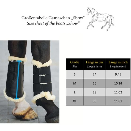 Robuste Gamasche mit Teddyfell-Innenseite und Kunstleder außen. 3 Klettverschlüsse mit Elast sorgen für einen optimalen Halt. Gleiches Modell für vorne und hinten, hinten eine Nummer größer nehmen.