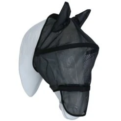 Die Fliegenmaske aus strapazierfähigem Mesh-Material gewährleistet mit dem Bügel einen sicheren Abstand zum Auge. Das Nasenteil kann durch einen Klettverschluss abgenommen werden. Der aufgenähte Schlauch im Genickbereich ermöglicht ein Durchführen des Halfters. Die Ohren sind aus einem weichen, luftdurchlässigen und stabilen Material, der Nasenrücken ist mit weichem Kunstfell gepolstert.