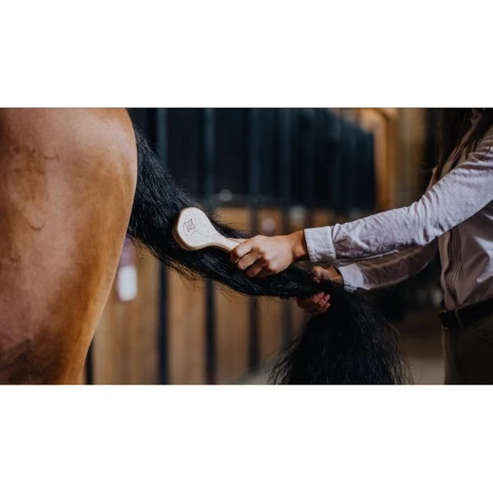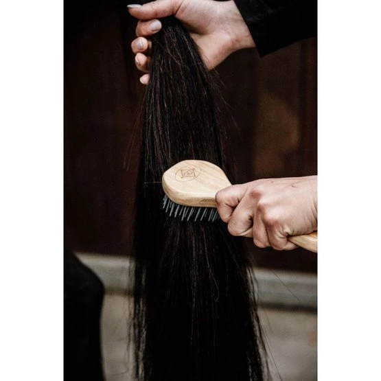 Der Griff der Mähnenbürste besteht aus antibakteriellem, leicht zu reinigendem Gummiholz. Die Stifte sind aus Polypropylen, das flexibel genug ist, um das Haar zwar nicht zu beschädigen, aber stark genug, um alle Knoten aufzulösen.