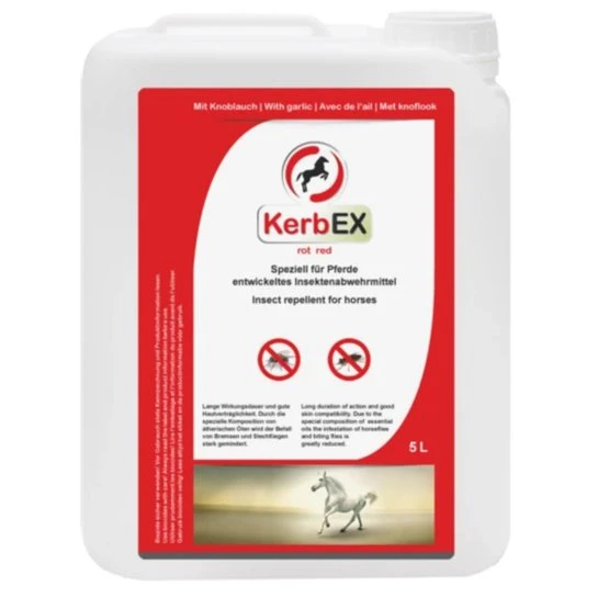 KerbEX Rot ist ein registriertes Abwehrmittel gegen Bremsen, Mücken, Kriebelmücken und Zecken, das nach jahrelanger Forschung und in Zusammenarbeit mit Pferdebesitzern entwickelt wurde. KerbEX Rot zeichnet sich durch eine starke und lang anhaltende abweisende Wirkung und optimale Hautverträglichkeit aus. Neben dem Wirkstoff Icaridin und Knoblauch enthält das Produkt natürliche Öle von Teebaum, Nelke, Zitrone und Eukalyptus. Diese spezielle Kombination mit natürlichen äthersichen Ölen reduziert die Belästigung von Bremsen und Stubenfliegen erheblich. Bei regelmäßiger Anwendung wird die Wirkung verstärkt. Sie werden von der hervorragenden Wirkung begeistert sein!