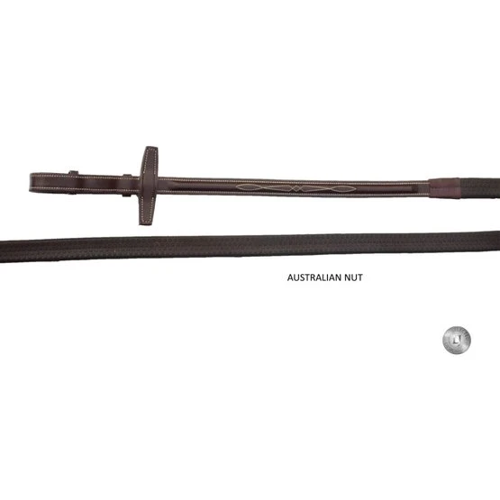 Gummizügel aus englischem Leder mit Blindverschluss, Messingschnallen und Ziernähten auf Leder. Gummi ist 16 mm breit.
