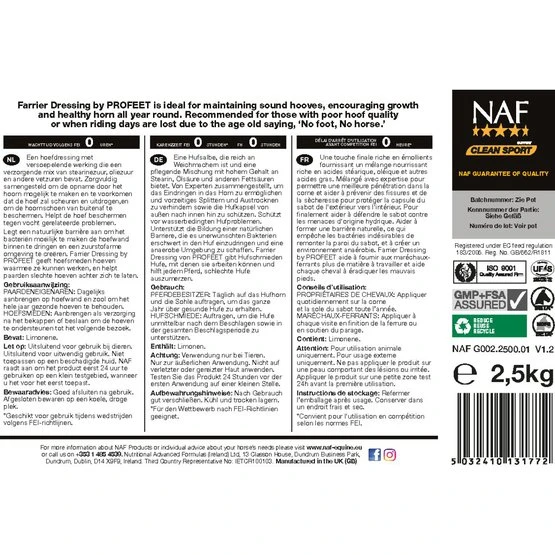 Ist eine einfach anzuwendende Hufsalbe, unabhängig vom Wetter. Es ist ideal für den Einsatz in Ställen. Es wird in einem praktischen Eimer geliefert, damit Sie es überall hin mitnehmen können, wo Sie es brauchen. Das Hufschmied-Dressing ist auch in einem größeren Eimer erhältlich, was es ideal für den Einsatz in großen Ställen macht, in denen mehrere Pferde versorgt werden. Hufschmied-Dressing kann täglich als letzter Schliff vor dem Reiten, während längerer Pferdeställe oder zu jeder anderen Zeit, wenn die Hufpflege ansteht, verwendet werden. PROFEET Hufschmied Dressing wurde von Hufschmieden für alle Hufarten entwickelt. Es ist ideal, um ganzjährig gesunde Hufe zu erhalten und das Hufwachstum und einen gesunden Hufschuh zu fördern. Es wird für Pferde mit schlechter Hufqualität empfohlen, insbesondere wenn Pferde aufgrund schlechter Hufqualität weniger geritten werden können. Ein altes Sprichwort unter Hufschmieden lautet „Ohne Fuß kein Pferd“, und Hufschmied-Dressing fördert die Erhaltung gesunder Hufe und hilft zu verhindern, dass Sie Ihr Training wegen schlechter Hufe anpassen müssen. Es ist eine flüssige, gelartige Hufpflege mit entspannender Wirkung, die eine pflegende Mischung aus Stearinsäure, Ölsäure und anderen Fettsäuren enthält. Der Verband wurde mit größter Sorgfalt formuliert, um eine Aufnahme durch das Hufhorn zu ermöglichen und um ein Reißen und Austrocknen des Hufs zu verhindern und den Huf von innen zu schützen. Darüber hinaus trägt es zum Schutz der Hufe vor Feuchtigkeitsproblemen bei und eignet sich hervorragend für Hufschmiede nach dem Nageln der Hufeisen. Das Hufschmied-Dressing hilft, eine natürliche Barriere gegen Bakterien zu schaffen, die durch die Hufwand oder alte Nagellöcher in den Huf eindringen, um im Huf ein für das Pferd unerwünschtes sauerstoffarmes Milieu zu schaffen. PROPHET Hufschmied-Dressing gibt Schmieden Hufe, mit denen sie arbeiten können, und hilft Pferden, schlechte Hufe hinter sich zu lassen.
