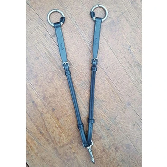 Verstellbares Ledermartingal mit Ringen, die sich öffnen lassen. Die Rinde des Martingals lassen sich öffnen, sodass die Zügel nicht mehr aufgeschnallt werden müssen. Verstellbar. Feststellung des Martingalriemens am Halsriemen. Edelstahlschnallen.