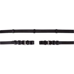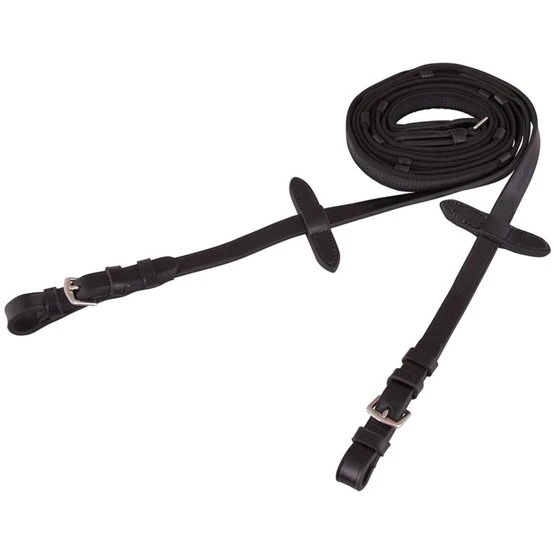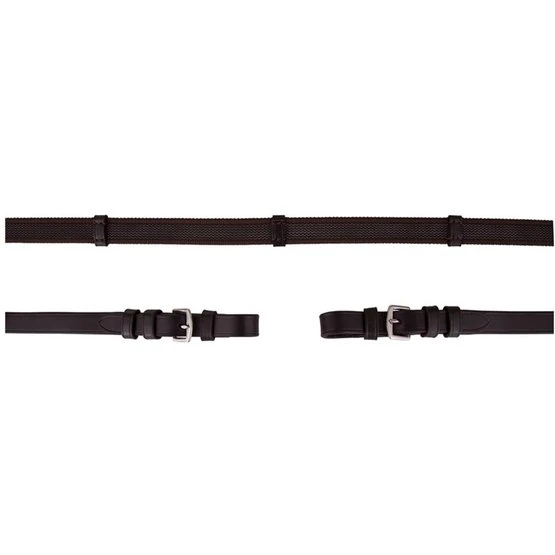 Gurtzügel mit Gummieinlage für mehr Halt. Die Anti-Slip Zügel (19 mm breit) haben Lederstege und Martingalschieber. Die Lederenden haben Edelstahlschnallen und sind 16 mm breit.