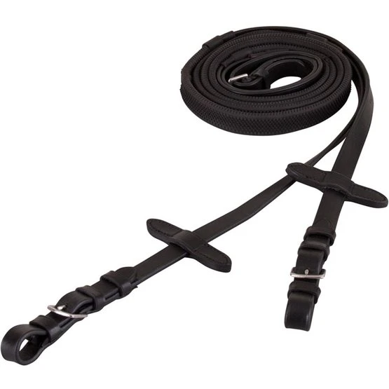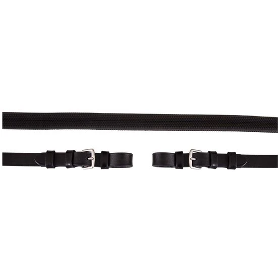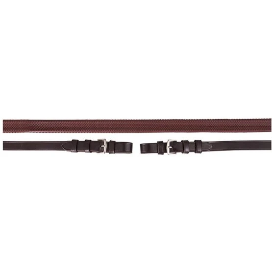 Gummizügel (16 mm breit) mit Martingalschiebern und verstärkender Nyloneinlage. Die Lederenden haben Edelstahlschnallen und sind 16 mm breit.