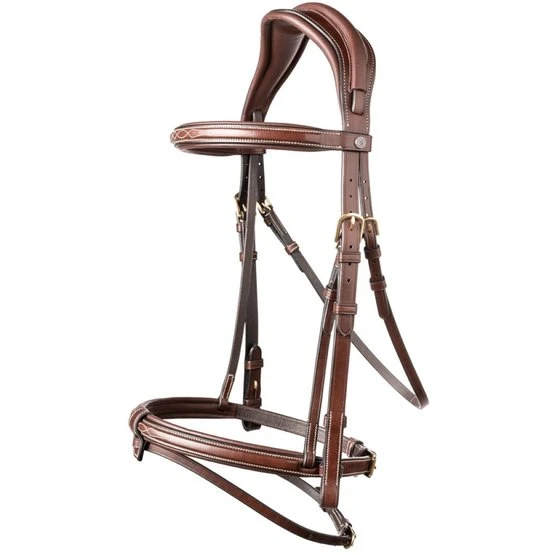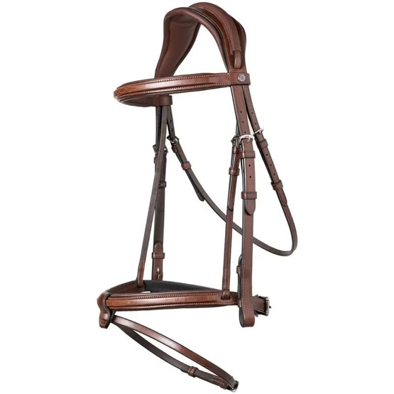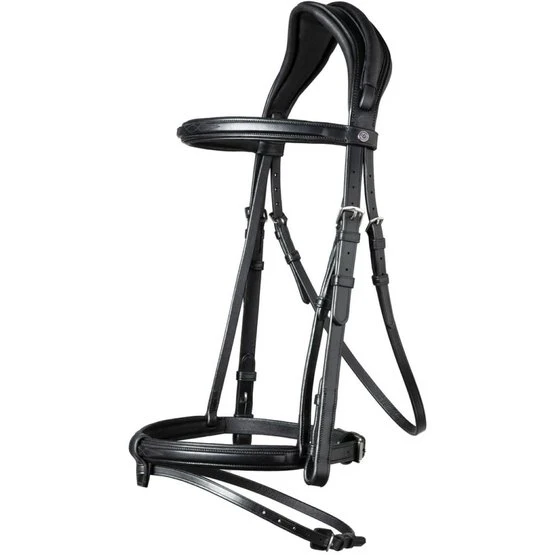 Das TRUST Geneva hat ein originelles Genickstück und einen entfernbaren Sperrriemen. Der Riemen des Nasenriemens verläuft über eine Ledereinfassung über das Genickstück. Das Genickstück ist breiter als normalerweise und doppelt anatomisch. Es verfügt zudem über eine besonders dicke (10 mm) Polsterung mit Aussparung in der Mitte, was für eine perfekte Druckverteilung sorgt. Der Sperrriemen lässt sich durch die Schlaufe am Nasenriemen mühelos abnehmen, sodass das Zaumzeug auch ohne Sperrriemen verwendet werden kann. Der Schnallenschutz am Nasenriemen ist besonders groß, damit die Schnallen niemals den Pferdekopf berühren. Nasen- und Stirnriemen sind eckig bombiert und mit einer Zierstickerei versehen. Letzteres ergibt einen schönen Effekt.