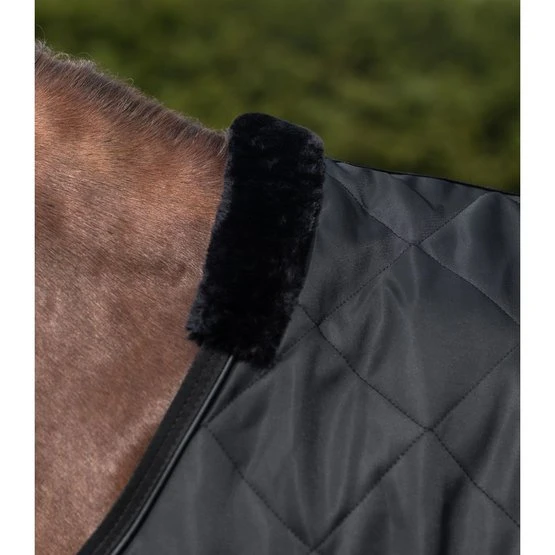 Hochwertige Führmaschinendecke gefüttert mit künstlichem Kaninchenfell für die kalten Tage. Das Kaninchenfell speichert optimal die Körperwärme des Pferdes, ist besonders weich und verhindert Scheuerstellen. Durch das Felldetail am Widerrist werden Druckstellen verhindert. Mit längenverstellbarer Kreuzbegurtung, T-Frontverschluss und Metallösen zur Befestigung eines Schweifriemens.