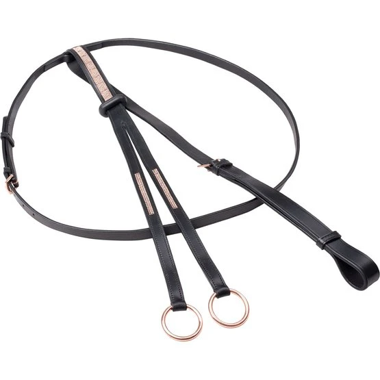 Martingal in bester Lederqualität, hochwertig verarbeitet. Mit edler Strasskette in der Gabel und im Brustteil. Edelstahlschnallen in rosé finish.