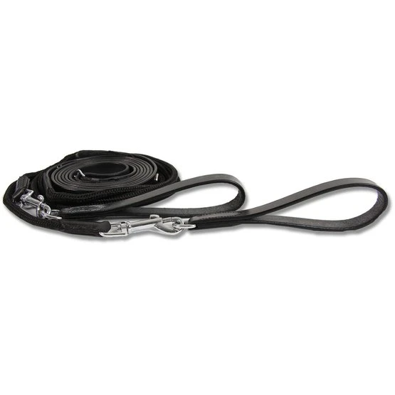 Lederschlaufzügel mit rund geflochtenem Nylonseil. An beiden Enden mit Lederschlaufe und Karabinerhaken, wodurch der Schlaufzügel ohne Mühe ausgehakt werden kann.